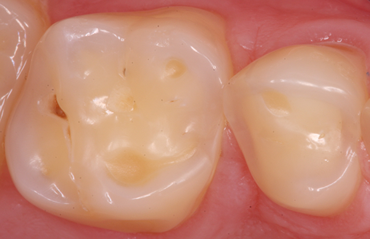 Syreskader viser sig typisk som gennemsigtige og ujævne kanter på fortænderne. Måske oplever du, at små stykker tand knækker af. På kindtænderne ses typisk små gullige fordybninger.